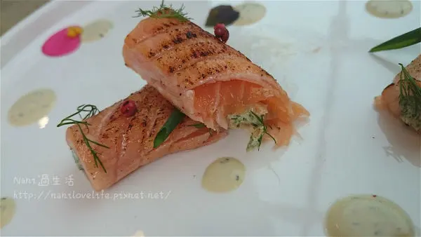 這道超好吃的!不容錯過,新鮮的鮭魚僅將外皮大火炙燒,包裹進搭上蒔蘿優格的內餡,點綴巴西紅椒粒和蝦夷蔥,一刀劃下一口咬下,咀嚼中優格和魚肉鮮甜完美結合,鮭魚的油脂在嘴中化開,清爽不膩口,恰到好處的調味讓人著迷,就是標準會產生「吃完會忍不住想再點一盤」的衝動!