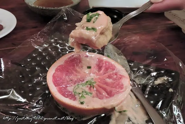 食用之先~ 請先將葡萄柚的汁用湯匙擠壓出,並淋在圓鱈上