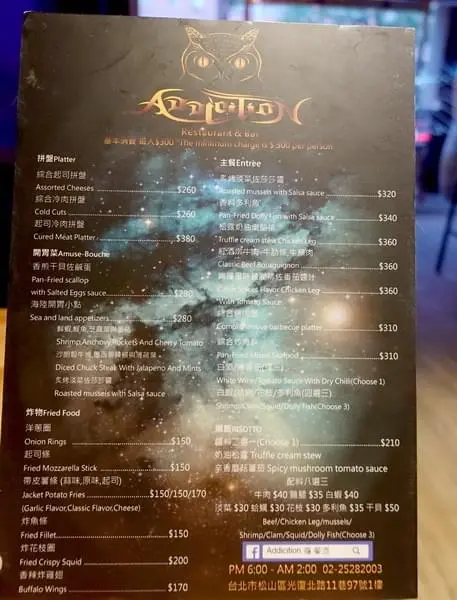 餐點有拼盤、炸物、主餐、還有各式的酒飲