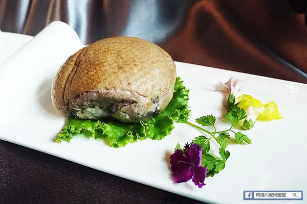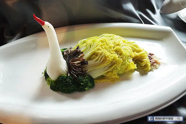 畏公白菜這道呈現在眼前讓人眼睛一亮,做成鳥類般的華麗造型,在民初時期譚延闓除了喜愛高檔食材外,也非常喜歡白菜,特別是鮮嫩的芽心部位,主張以湯將芽心煨軟取其精華讓這道平民菜色廣為流傳黃清標主廚特別取其芽心最鮮嫩的部位,加以黃燜湯煨煮入味,其實光看不過癮,還會讓人想嚐嚐其味道呢!