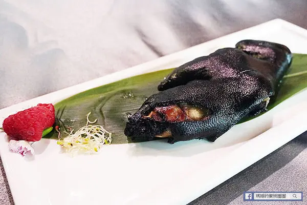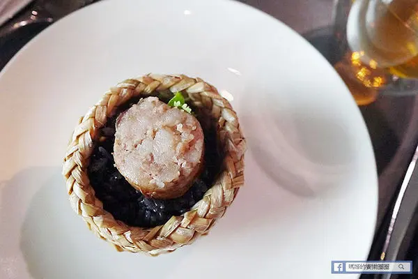 「草袋烏香飯」正宗的烏飯就是用烏飯樹的葉子搗爛了浸泡糯米,再經蒸製成。主廚選以泰國香糯米浸泡在烏樹汁,僅放入鹽調味,然後蒸熟,佐以香腸提味。咀嚼之際可以感受烏樹汁特有的清香。