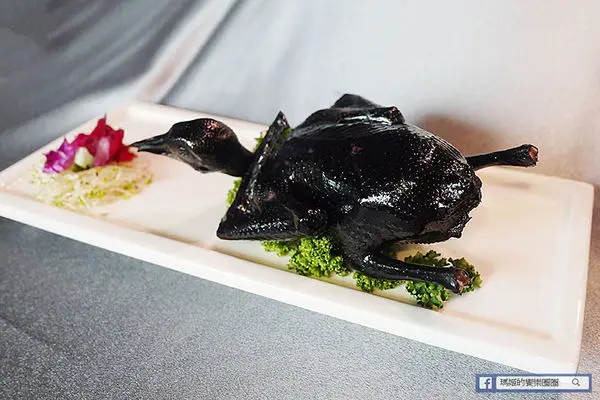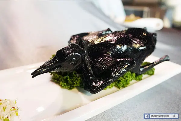 「南燭樹汁烏皮鴿」烏飯樹在南京叫「南燭」,也叫「青精樹」。它的汁具有一種特殊的清香,而且還有明目補腎的效果。主廚選以350克一隻,養殖17~18天的小乳鴿,先經燒毛、除腥味、泡烏樹汁10小時,然後蒸五分鐘定色,再入鹵水滷五分鐘,水吹乾後炸即成。