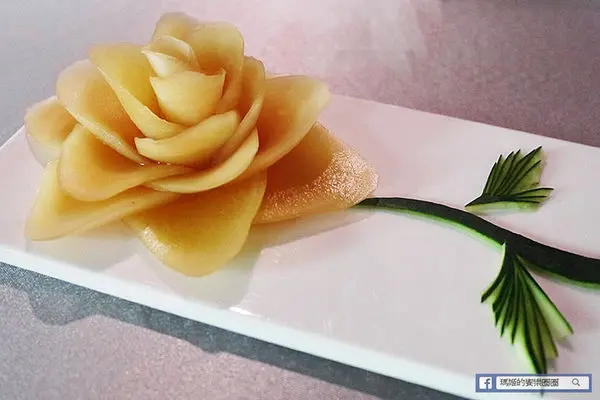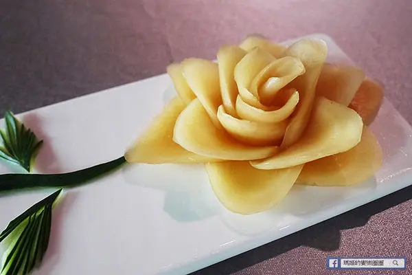 醬醃脆蘿蔔以玫瑰花型排列成一道具有藝術美感的涼菜,這不僅講究主廚的刀工和美感,當然基本調味的功力也很重要,雖然它只是一般的醃蘿蔔。