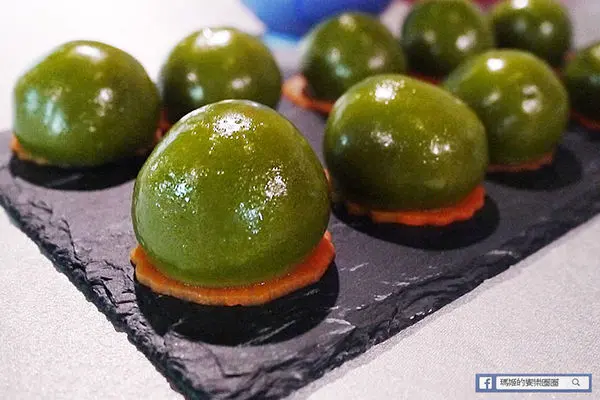 青糰子的外皮是用菠菜打成汁和入麵粉下去做的很像台灣傳統平民小吃草仔粿只是變成揉成小球狀的飯後甜點下方以紅蘿襯底增加視覺上的對比。
