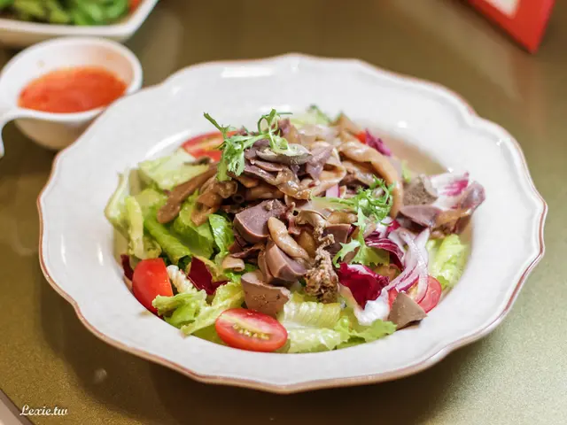 夏天先來一道清爽菜色,生菜沙拉當中加入了鴨肝、鴨胗、鴨腸,可以說是將鴨鴨使用的淋漓盡致。但鴨內臟基本上只是簡單處理清燙,主要調味來自於旁邊配上的泰式醬料,但它又蓋不太掉內臟味。這樣的吃法我不是很習慣,這道算是今天我唯一給普評的菜色。