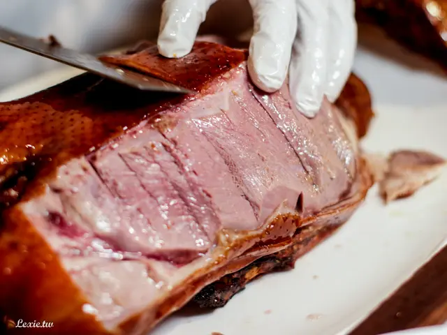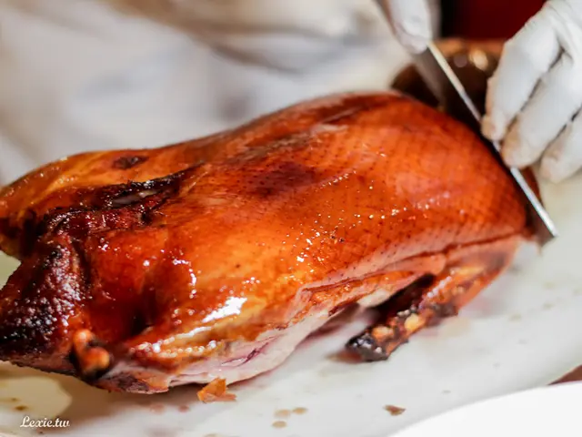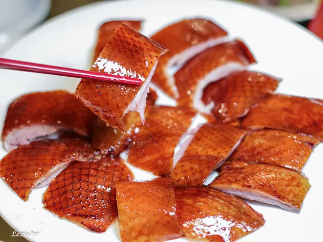 鴨隻肥碩,外皮呈現咖啡色的油亮色澤,烤色均勻、光看令人食指大動, 師傅會先在旁邊片好鴨肉再送上來。