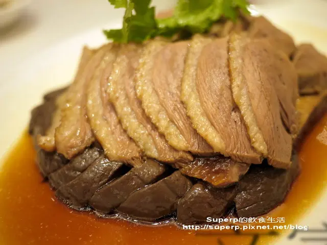 鹵水鵝片中份$840(滷好的鵝胸切片,下面墊了鵝血或鴨血以及百頁豆腐。原本期待很高,但吃了後發覺只有鹵水的鹹味而已,味道沒什麼層次。應該是鹵水還養的不夠久。以前記得去吃過神旺潮品集的鹵水鵝,水準極高。而去香港所吃到的阿鴻小吃的更是大勝潮江燕,可惜了)
