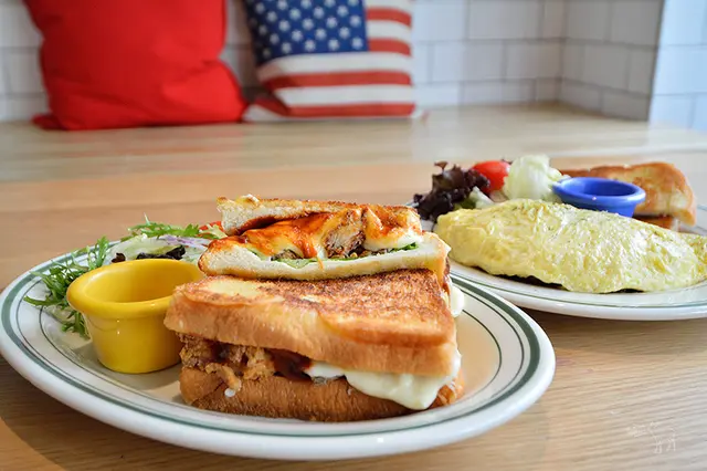 但我覺得豬肉培根這大項更加有創意,因為台式滷肉、炸排骨、青蒜香腸、番茄培根炒蛋這些台式料理竟然也跟西式的乳酪三明治所結合了!不過由於我們其他品項有點了這些也是中西合併的料理,所以在招牌的乳酪三明治品項便選擇了水牛城辣味炸雞的口味。