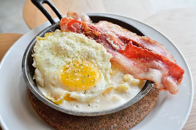 通心麵軟中帶點Q度,口感還不錯,與乳酪醬煮挺香的,不過我覺得吃多會膩口,而且配料僅有上方的兩片煎培根與煎蛋,整體吃起來會略為單調。