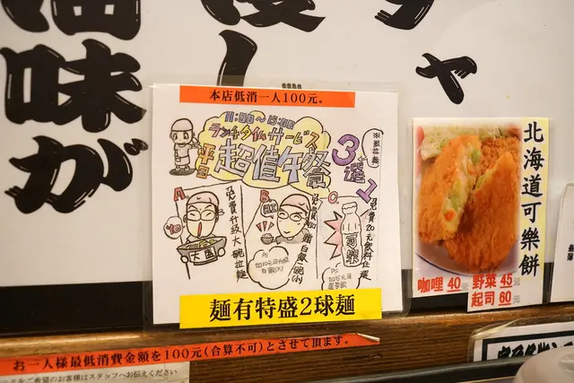 店內低消為100元、特盛指的是拉麵裡頭有兩球