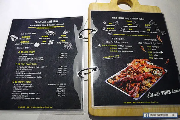 再來主餐的部份,先點海鮮有分ABC餐,看人數和內容去點,海鮮的價格就列在黑板上,會依照時價而有所變化,第二步驟選配料,像玉米、花椰菜、蛤蜊、香腸這些,接著再選醬料和辣度,就能請服務人員料理囉!