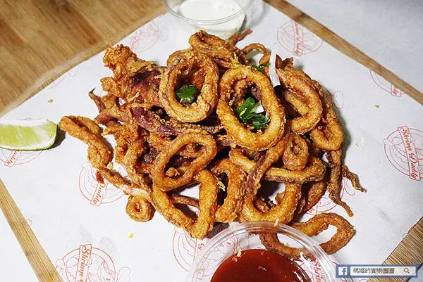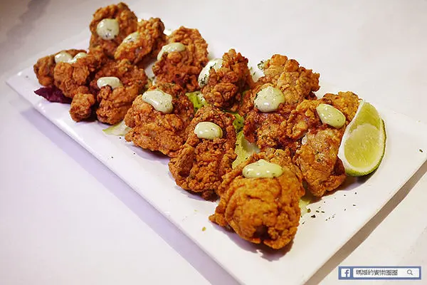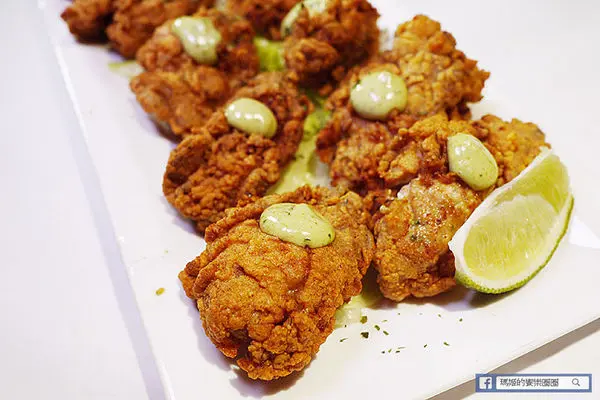 「美式酥炸牡蠣」280元,一整盤滿滿的牡蠣很鮮甜,外層炸的金黃酥脆,搭配九層塔香蒜醬好滋味!