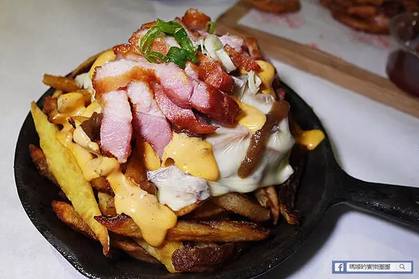 「西部薯條」220元,裡面加了五花肉、焦糖洋蔥、起司和肯瓊辣醬,底下以薯條和地瓜薯條做組合。