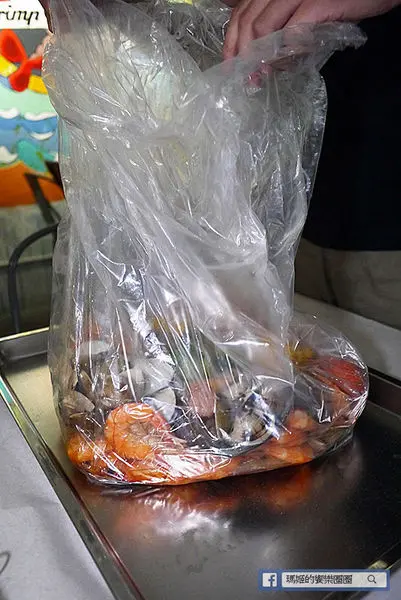 我們的海鮮大餐來囉!這出場和一般有美美擺盤上桌的方式不同,用大的透明塑膠袋裝著,應該是方便醬料均勻的混合在每種食材上。