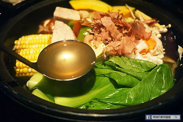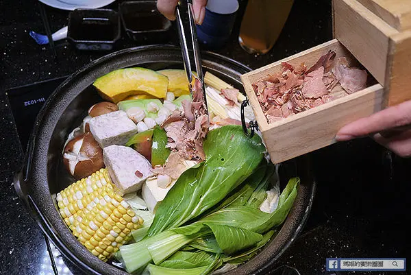 高湯上桌啦!這裡是連同聚寶盆綜合蔬菜盤一起放進鍋裡,看起來好豐盛,這時候服務人員就會詢問是否要加柴魚片來增加風味,店裡是進口日本的手刨柴魚片,放在木盒裡再拿出來加,看起來質感很好