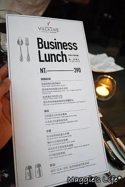 商業午餐一套390元,含開胃菜、湯品、主餐和飲品,份量都和一般的正餐份量相同,適合偶爾想對自已好一點又精打細算的朋友。