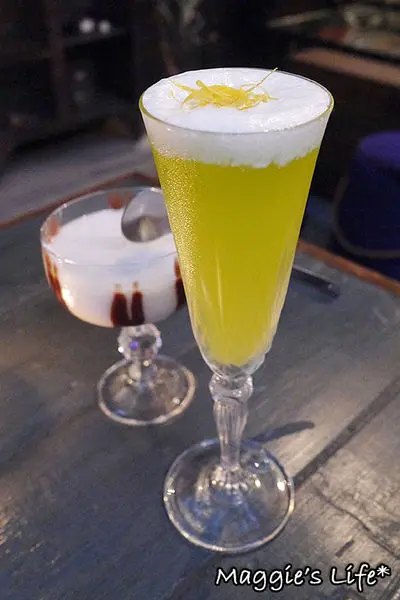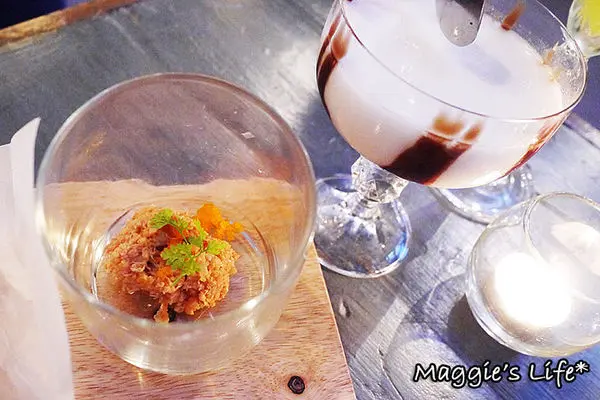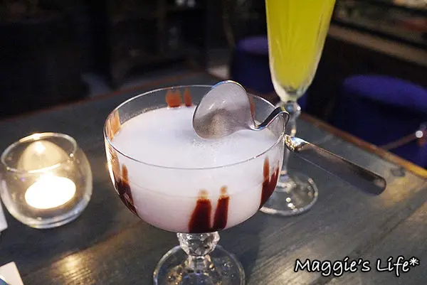 咖啡奶香調酒,杯邊抹上巧克力醬,喝的時候用湯匙攪拌開來,咖啡和奶香濃郁,酒精濃度在入口後略有後勁,要小心品嚐。(未成年請勿飲酒/請勿酒駕)