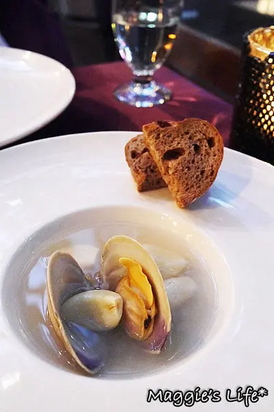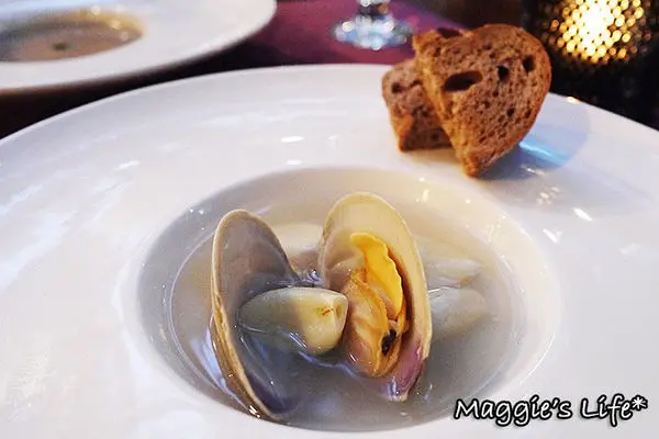 「日式燉蒜馬蹄蛤精力湯」搭配軟法麵包,大顆飽滿的馬蹄蛤,肉質肥美鮮甜,加入整顆蒜頭精燉,清爽中但點蒜香鹹味,是一般少見的湯品。