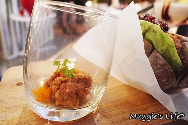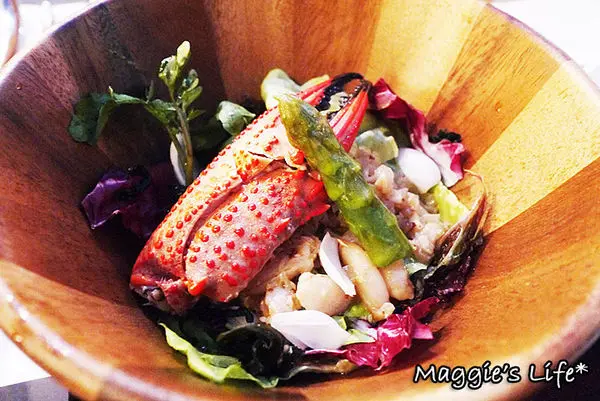 「墨西哥蒸烤龍蝦慕斯佐雜糧軟法」送上來以小木盤裝著,搭配一杯裝飾美麗的龍蝦沙拉,感覺很有質感的一道開胃菜,很有義法料理以精緻擺盤的風格。
