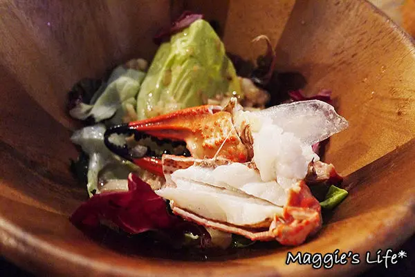 「石蟹螯水花沙拉佐蒂蓉芥籽」特選烏石港石蟹鉗加上蘆荀和許多生菜,還有好多的蟹肉在其中,每一口都讓人吃到滿滿的海洋鮮滋味!