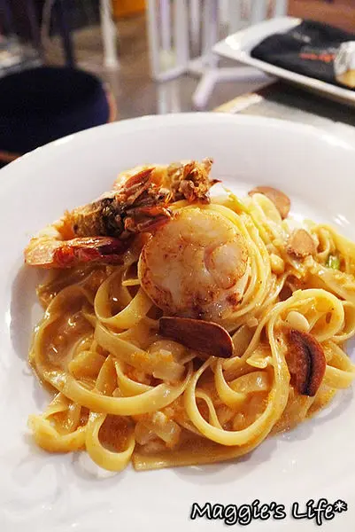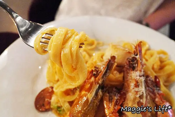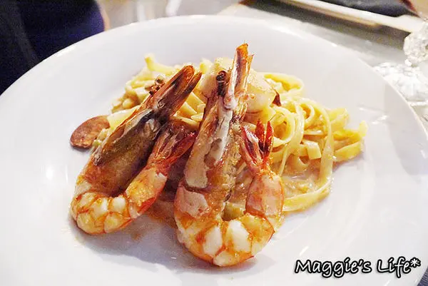 「明太子奶油干貝鮮蝦義大利寬麵」二大隻去好殼的鮮蝦像是示威般的跟我打招呼啊!