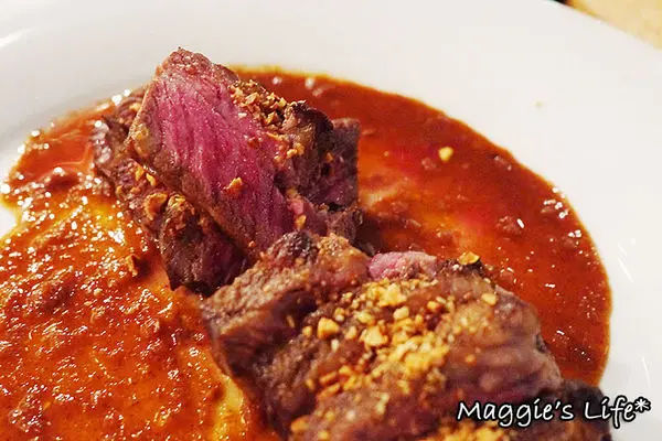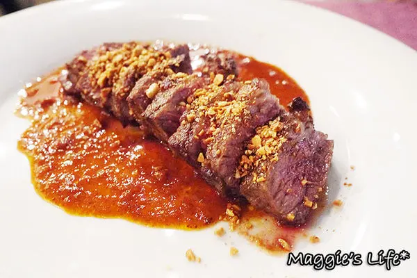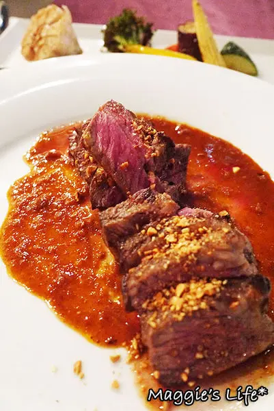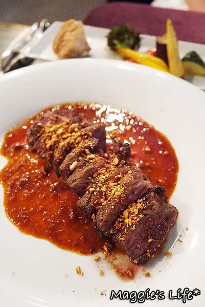 「臻果牛小排佐老味紅酒醬汁」送上來已經切片,方便食用,上頭灑滿臻果碎粒,印象中好像第一次吃牛排配臻果碎粒呢!
