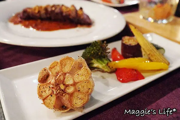 牛排搭配的菜盤,有烤好的蒜頭和甜椒、玉米筍、花椰菜和櫛瓜。