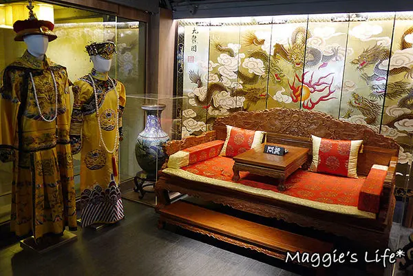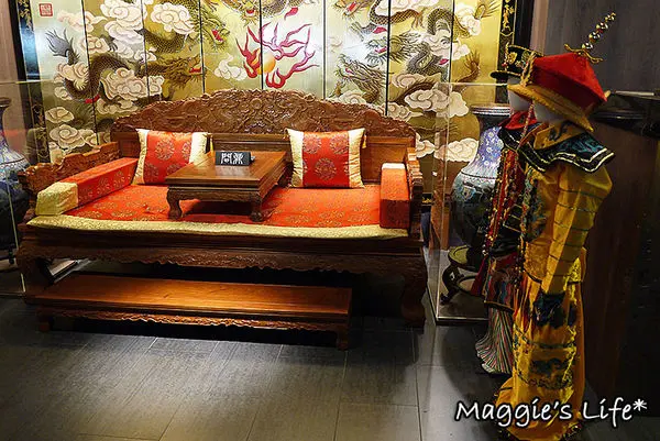 二樓的接待區就有古色古香的佈置,那左手邊皇帝皇后穿的龍袍華服,也可以拿起來穿,然後坐在這客廳裡拍照,不過我們嫌換裝太麻煩,還是算了吧!