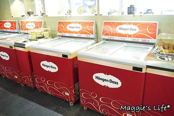一整排四大冰櫃的哈根達斯冰淇淋,可碗裝也有用餅乾甜筒,等等吃到尾聲一定要留給空間來裝XDDD