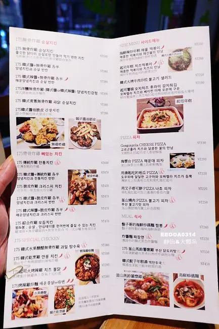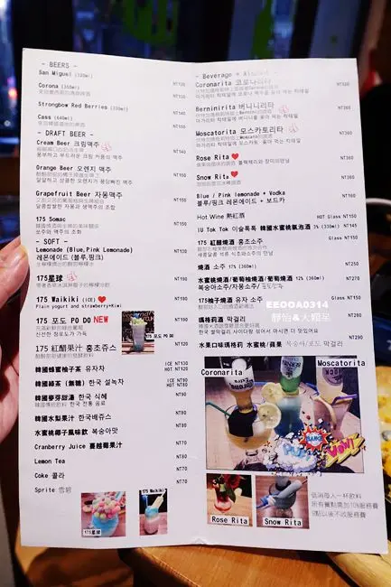 有韓式炸雞、年糕、披薩、炸醬麵及馬鈴薯燉雞等,另有飲品及酒類,光看飲品圖片就覺得相當有噱頭 (開車不喝酒、未成年請勿飲酒)