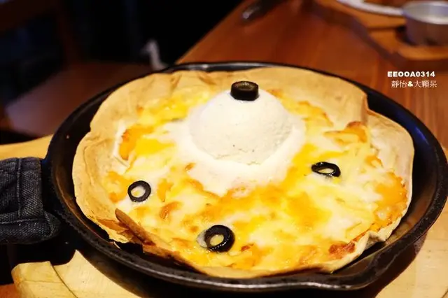 很有創意的披薩,酥脆的薄絣皮上鋪滿了香甜的地瓜泥及莫扎瑞拉起司,還加上了一球香草冰淇淋,隨著時間冰淇淋會慢慢融化唷