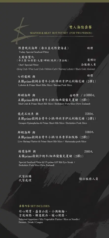 竹苑Shabu也會根據季節更換一些菜單,以粉專公告為主。強烈建議到這裡就是要吃主菜含有海鮮的鍋,才不枉此行!本次我們點的是雙人套餐- 鮮蟳海鮮與美國Prime穀飼去骨牛小排 $3880。