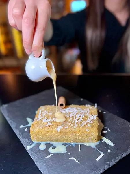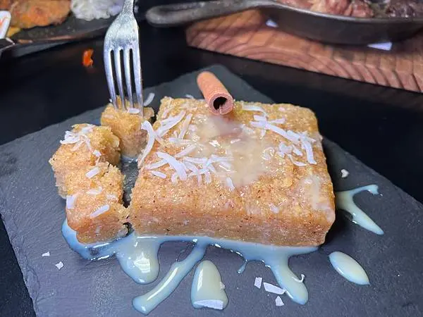 使用木薯、椰奶、肉桂、肉荳蔻、薑…等,製成木薯布丁,
