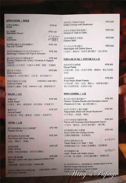 餐點以單點為主,有開胃菜、沙拉、Tapas、西班牙飯、主菜、甜點、無酒精飲料等,
