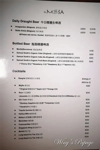 另有季節限量菜色,酒類則有精選啤酒、水果酒、調酒、西班牙紅白酒,