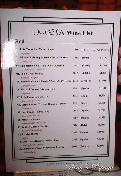 Rioja ……Tempranillo 2015(Spain),一瓶NT$ 950,一杯則是230,