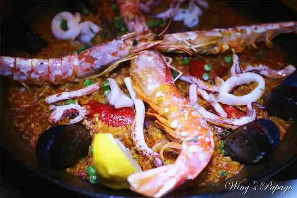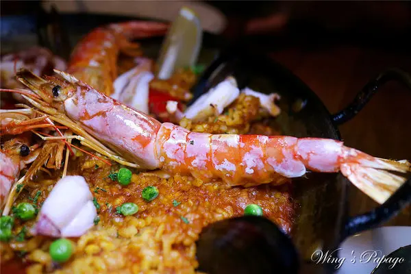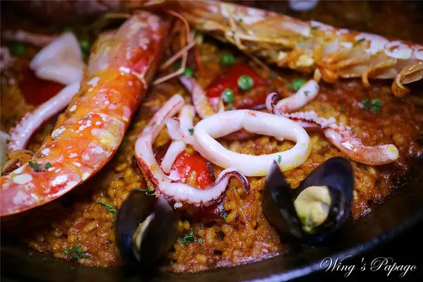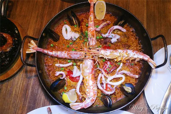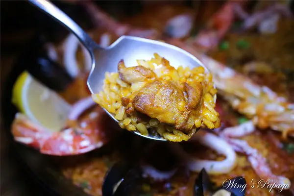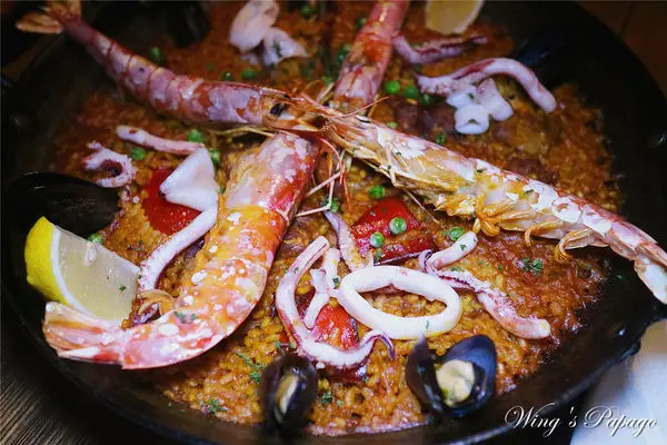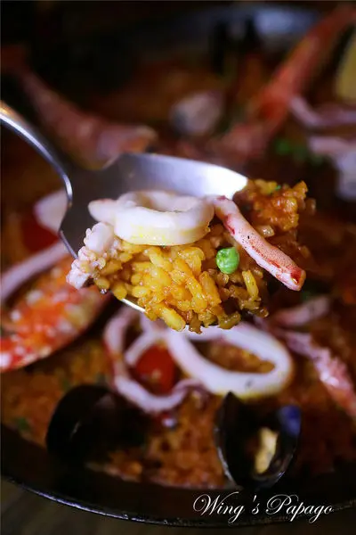 食材使用了天使紅蝦、花枝、貽貝、西班牙香腸、雞腿肉等配料,