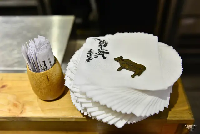 桌角有餐巾紙方便取用,上方的牛真可愛!