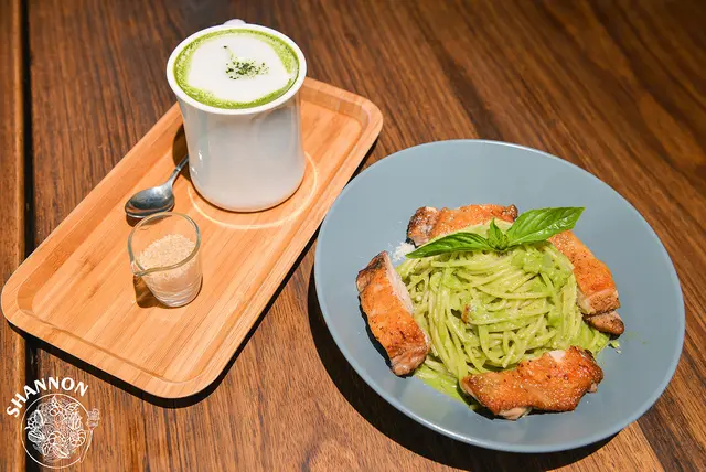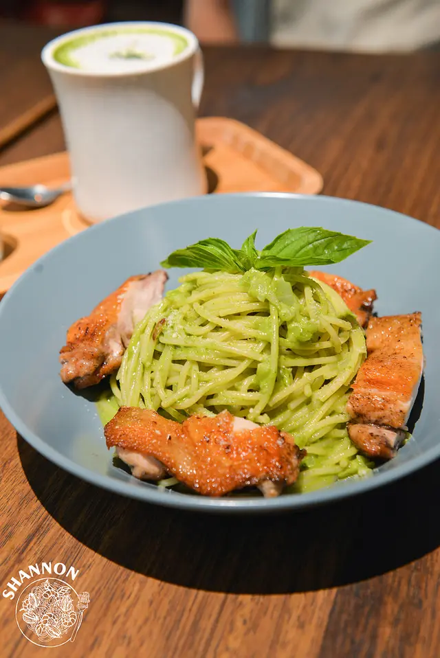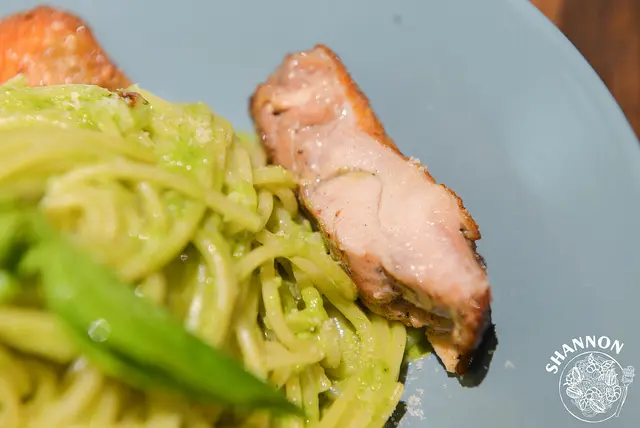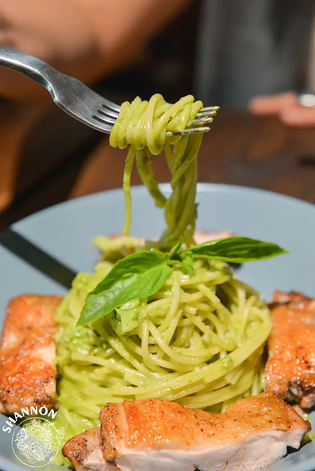 青醬的香氣濃厚我個人覺得表現的很不錯,麵條有彈性也令人喜歡!