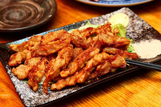 雞軟骨外層有撒上些許的七味辣椒粉調味,旁邊附上椒鹽跟蛋黃醬