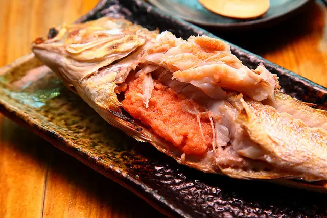 單吃馬頭魚可以品嘗到甘甜細緻的肉質,混著明太子一起吃,鮮上加鮮,佐上粒粒分明的明太子,口感相當有層次