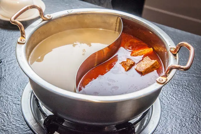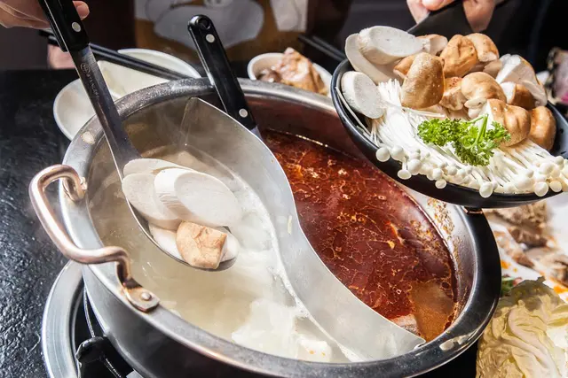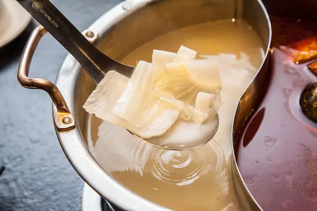 辣上癮極品麻辣鴛鴦的酸白菜鍋不似一般那樣嗆酸,酸白菜是跟二十多年合作的商家特製的,製作出來的酸白菜鍋帶有高雅的酸香,裡面還加入了筍片一同熬煮,更增添了酸白菜鍋的甜味深度