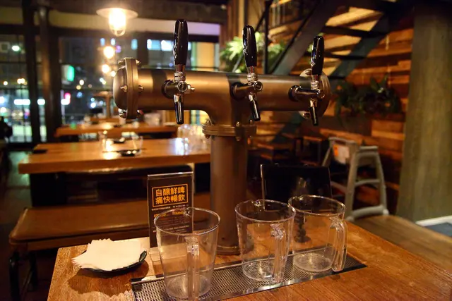 眼尖的朋友應該有注意到每個桌子桌上都有個像是水龍頭開關的機器,這台就是啤調客 Beeru的啤酒拉霸機,啤調客 Beeru希望客人都能體驗自己拉啤酒的樂趣,所以每一桌都設置了一台啤酒拉霸機,啤調客 Beeru有三種精釀生啤酒可以選擇:經典拉格、皮爾森拉格及黑啤No.5,三種啤酒的價格都是一樣的,以流量來計價,喝多少就拉多少