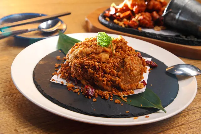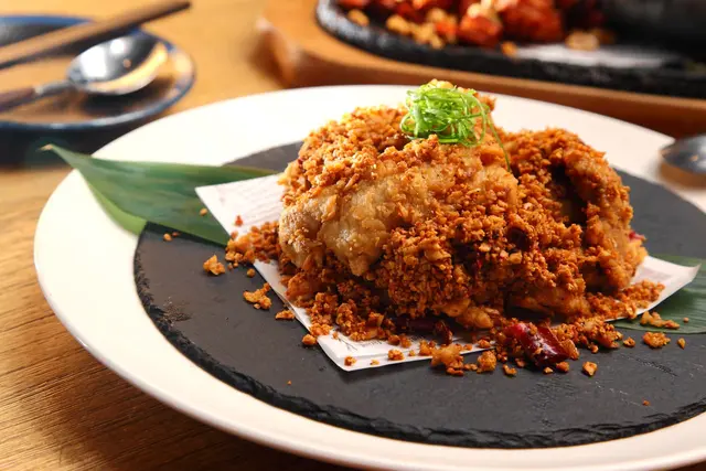 主廚使用市場俗稱的「老鼠肉」,不是真的老鼠的肉,而是指後腿肉中一個珍貴的部位,每頭豬只能取出兩塊,油脂含量少,口感Q嫩有彈性,主廚以避風塘式的作法呈現