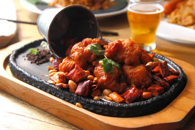 黃飛鴻潑水炸雞擺盤頗有美式料理豪邁的風格氣勢!嚴選雞腿肉酥炸搭配椒麻花生及台南DoGa 香酥脆椒餅,麻香酥脆的口感無疑也是啤酒殺手