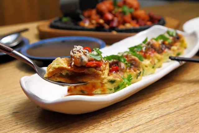 厚煎蛋的火候拿捏得恰到好處,外層帶有焦香的蛋香,裡面保有半熟蛋液,特調鹹鮮的魚香醬增添濕潤感,搭配上面酥炸的吻仔魚及肥嫩大鮮蚵,層層堆疊出飽嘴豐潤的口感