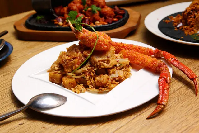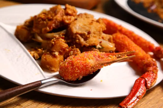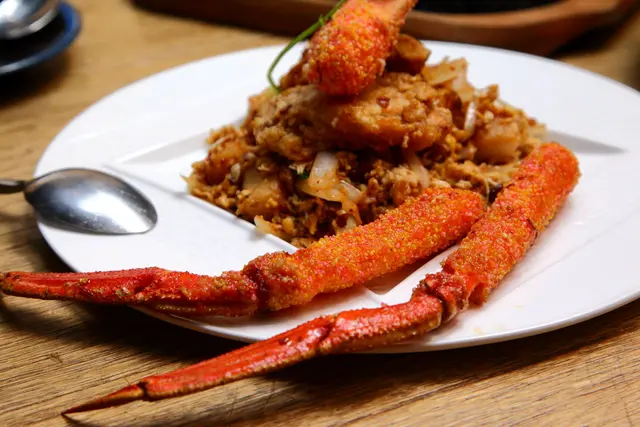 松葉蟹腳外表裹上特製的粉漿油炸,將風味清甜的松葉蟹肥嫩的肉汁封鎖在脆皮之下,咬開脆皮即可感受到松葉蟹特有似干貝的肉質口感