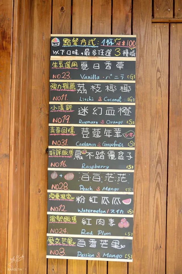 在Studio du Double-V的FB上看到口味已研發出有50多種,一天約提供9種口味的冰淇淋(一旁的編號是冰淇淋口味的編號),在最右邊也會用G、S來做區別是義式冰淇淋Gelato或是雪酪Sorbet。