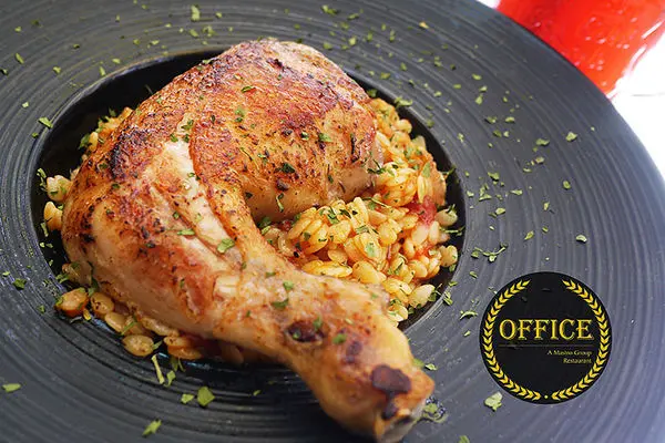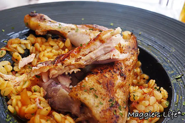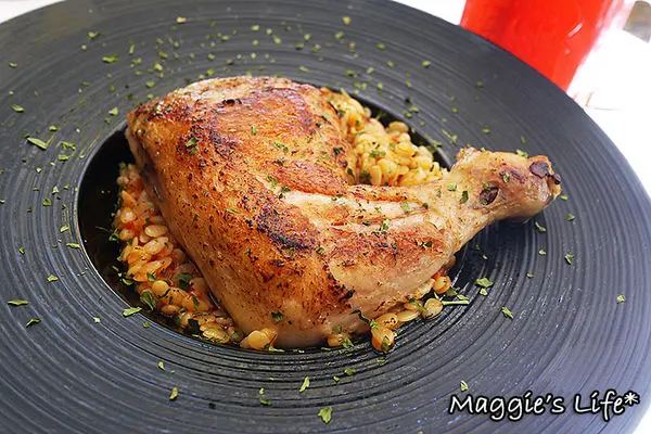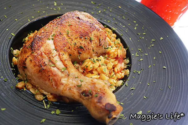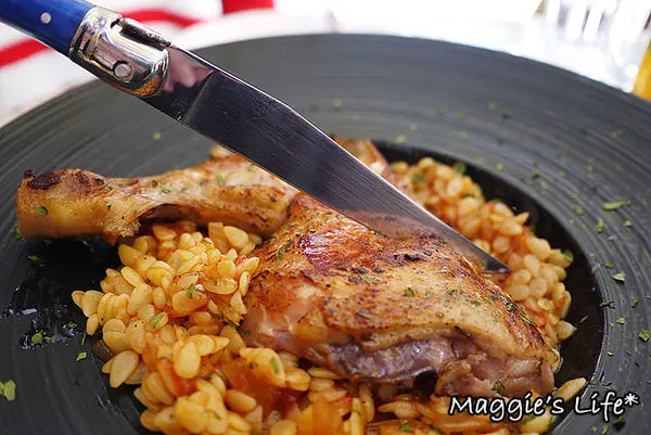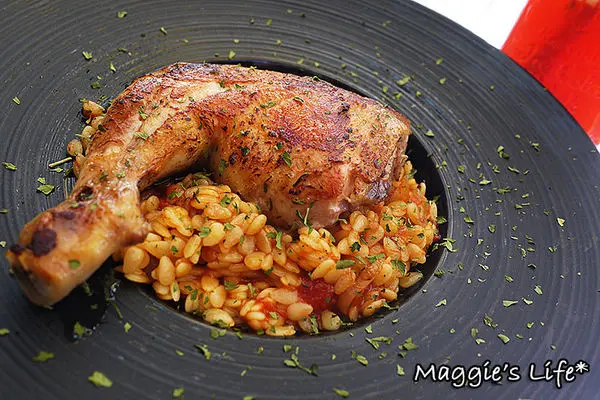 「茄汁油封雞腿燉飯」360元,依照傳統法國食譜的作法,將雞腿以16小時慢火油封,鎖住肉汁。