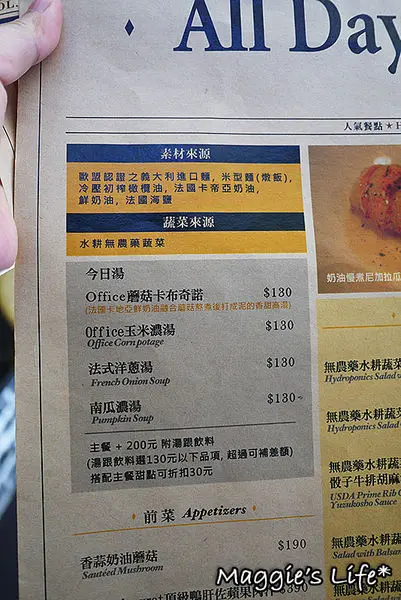 主餐加200元附湯和飲料,飲料選130以下商品,超過補差價即可。搭配主餐可另外單點甜點,可折30元。